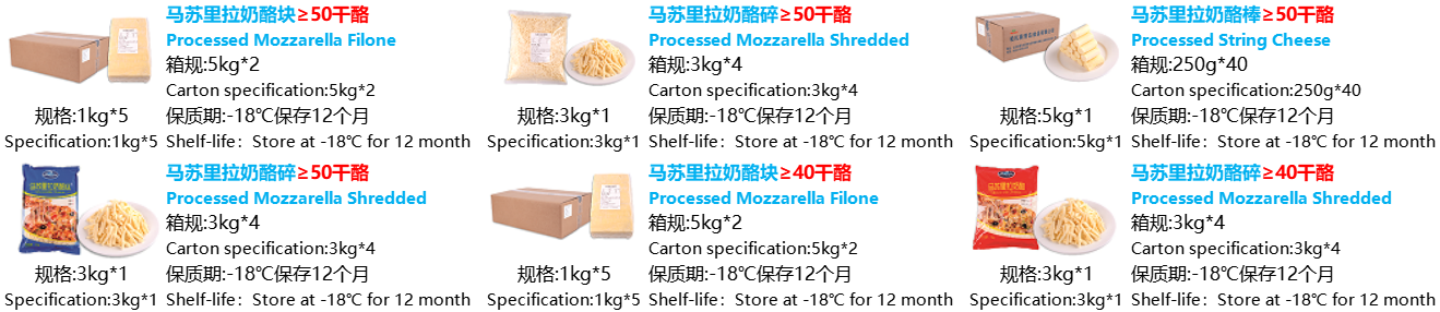 Processed Cheese (cheese content >50%) and Cheese Products (cheese content 15%-50%) are dairy products that are processed again based on the original cheese, which also have rich nutritional value. Their texture and flavor are different from that of the original cheese, making it easy to adjust the taste to meet the needs of different consumers, and they have a longer shelf life. They are usually used to make pizzas, baked rice, sandwiches, hotpot, barbecues, pasta, etc.